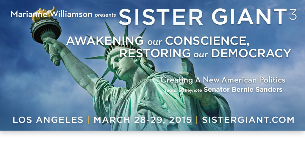 I am beyond thrilled to announce Marianne Williamson’s next SISTER GIANT Conference, to be held March 28-29, 2015, Live in Los Angeles as well as Livestreamed.